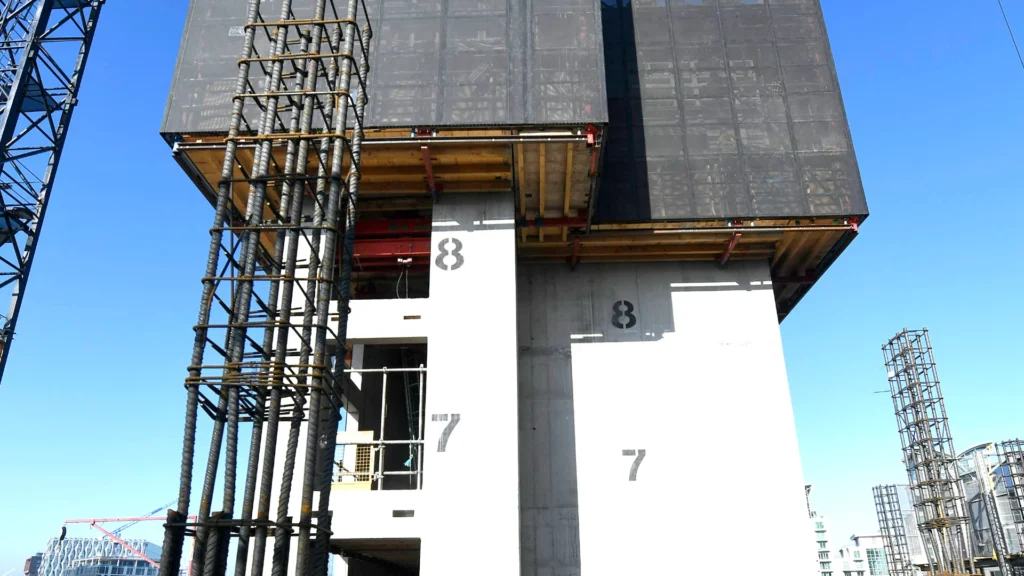 Jumpform systems are ideal for tower construction and complex cores, providing a controlled and safe working environment with continuous access beneath the rig. We customise every solution to suit the geometry, cycle time, and surface requirements of the project.